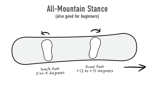 If you're new to snowboarding or an all-mountain rider, a great beginner snowboard setup is +12 to +15 degrees for your front foot and 0 to -5 degrees for your back foot. This stance gives you stability, versatility, and comfort across different terrain types.