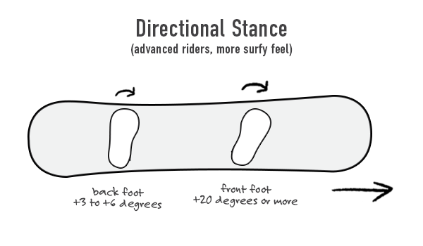 More advanced snowboarders might choose a directional stance, with both binding angles set to positive degrees, facing the nose. This type of stance is ideal for carving on groomed runs and provides aggressive edge control, although it can reduce mobility in rough terrain or while landing jumps since it limits hip movement.