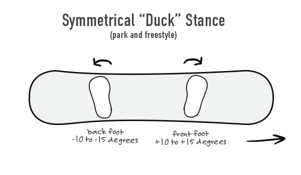 Freestyle snowboarders and park riders often prefer a duck stance, a symmetrical setup with +10 to +15 degrees on the front foot and -10 to -15 degrees on the back. This stance allows equal comfort riding regular or switch (backwards) and provides balance for jumps, spins, and tricks.