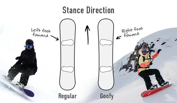 Regular or goofy refers to your stance direction and which foot is forward. Regular stance is with your left foot forward and your right foot back. Goofy refers to your right foot forward and left foot back. Most riders have their more dominant foot at the back to control steering, while the front foot works on balance.
