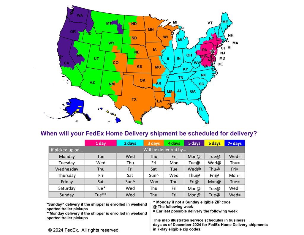 This map shows general FedEx Home Delivery transit times. We suggest choosing expedited shipping options based on this map and the transit times listed below if your order is needed by a certain date. If free shipping is chosen at checkout, we ship most orders via FedEx or USPS and use USPS for all PO Boxes. Most orders ship from eastern Pennsylvania.